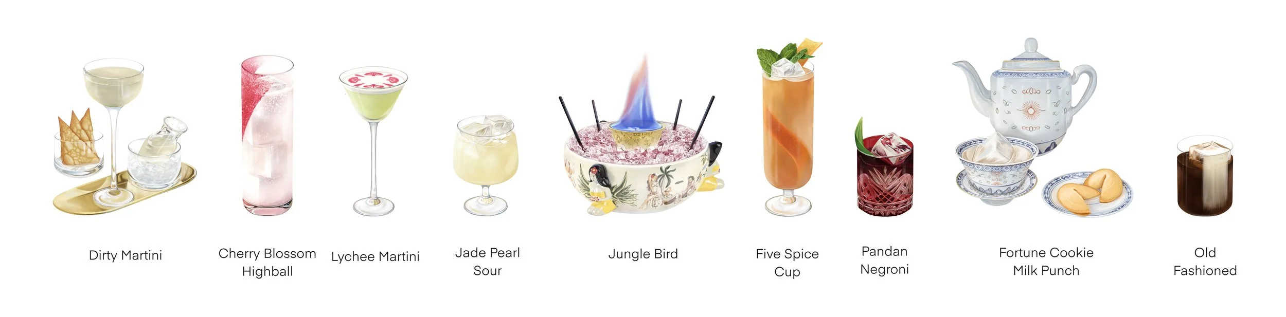I was commissioned to create a set of cocktail illustrations for House of the Red Pearl’s 2025 cocktail menu. The artworks were featured in their physical cocktail menu developed by Seaport Entertainment Group.