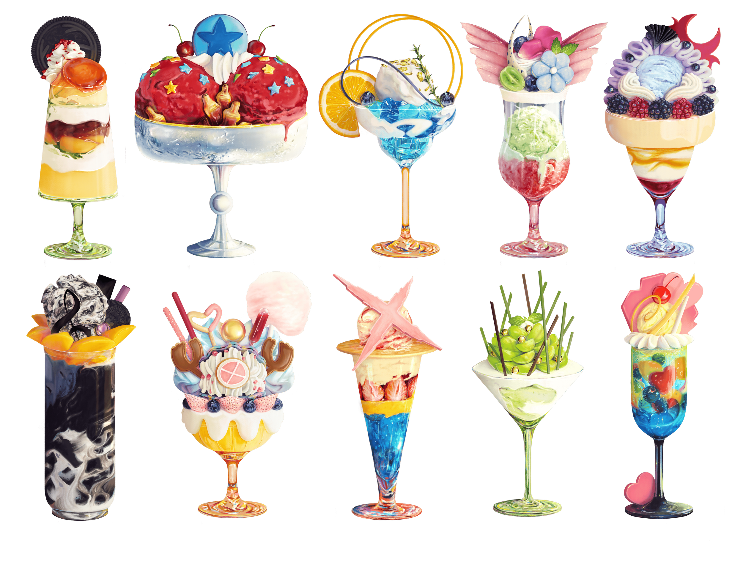 A playful personal project reimagining the Straw Hat crew from One Piece as parfaits, translating each character’s personality, colour palette, and signature traits into layered dessert compositions. This series explores character design through a food lens, combining fandom with flavour-focused illustration.